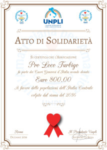 Con immenso orgoglio ed altrettanta emozione, comunichiamo la ricezione di questo importante riconoscimento da parte di UNPLI (Unione Nazionale Pro Loco d’Italia) per la donazione effettuata col cuore alle popolazioni colpite dal terremoto. Una bellissima soddisfazione! |